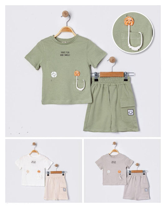 White Tshirt With Beige Shorts & 3D Ball Detail