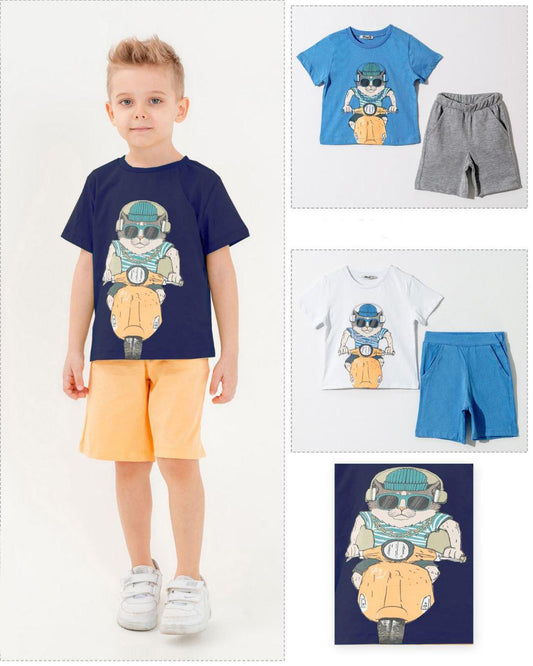 White-Blue Boys Moto Cat 2 Piece Shorts Set