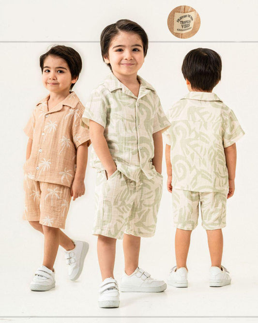 Linen Muslin Shirt and Shorts Set - Green Print