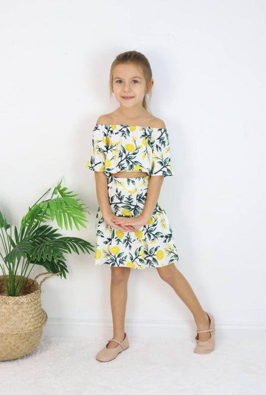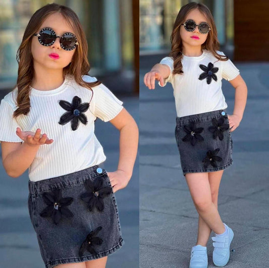Girls Set White Top with 3D Flower and Black Jean Skort