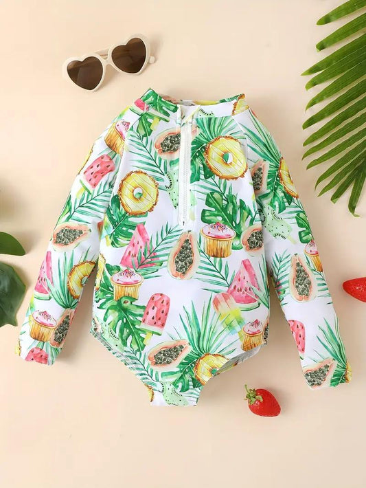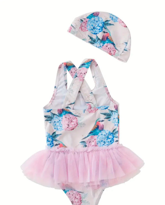 Girls One-Piece Swimsuit 3D Floral Design & Flamingo Print